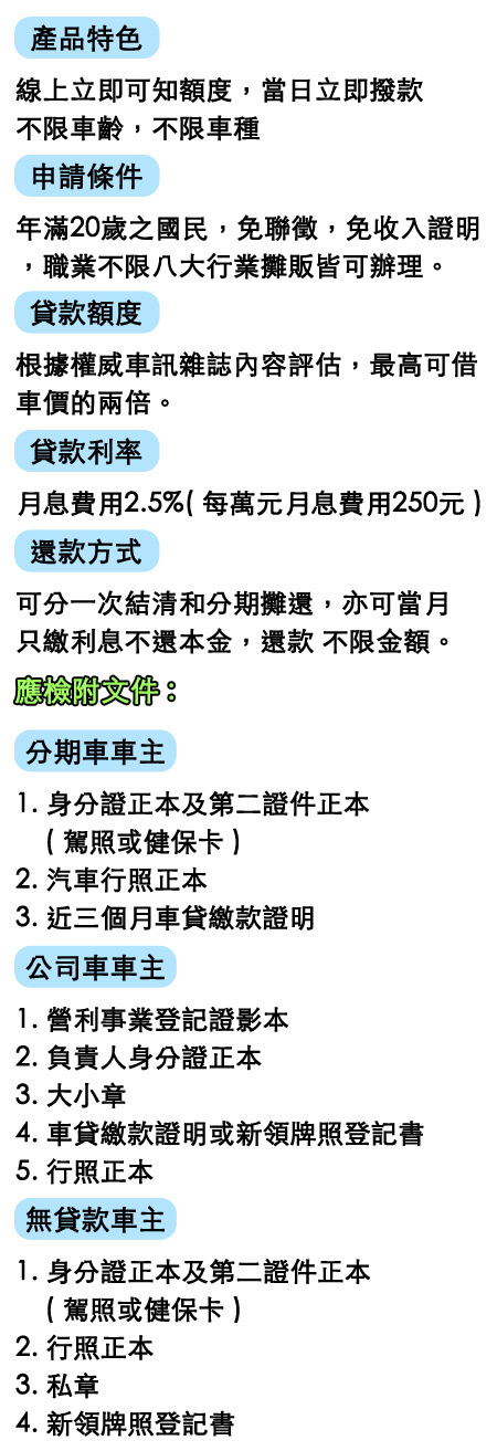 新北市優質當舖專業經營汽車借錢、機車借款免留車不限廠牌全車皆可承作缺錢速洽,讓您馬上有錢,簡單便利,審件速度快,申請文件齊全當日撥款,當舖借款沒有銀行繁瑣的手續,門檻低,免手續費即可辦理,汽機車借錢申請流程簡單,低利息,籌錢救急不困難,讓您的資金運用很簡單。